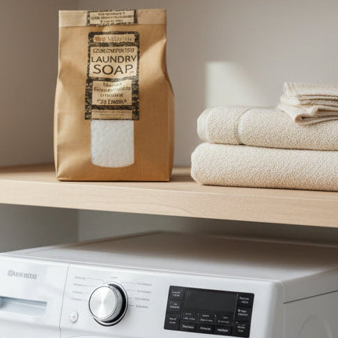 Om Naturale Laundry Stain Stick styled in laundry room setting with sustainable packaging, natural stain fighting essential oil bar